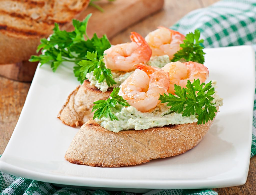 Crostini con Pasta de Guisantes y Camarones
