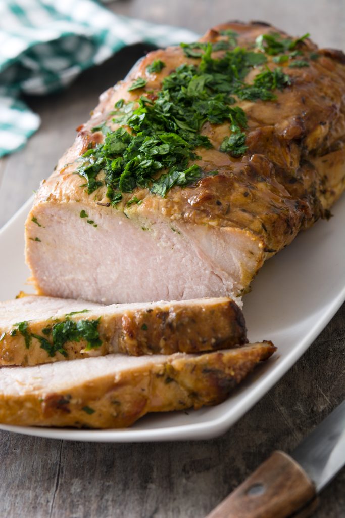 - Cubre el Lomo de Cerdo con perejil picado fresco, sirve el lomo con hierbas con jugos de cocción adicionales, acompaña con ensalada fresca de hojas verdes.